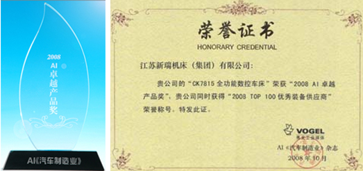 經(jīng)過(guò)評(píng)分統(tǒng)計(jì)并參考專(zhuān)家評(píng)委提交名單的數(shù)量,同時(shí),結(jié)合電話(huà)調(diào)查的意見(jiàn)反饋,最終有66個(gè)產(chǎn)品被評(píng)為 “2008 AI卓越產(chǎn)品獎(jiǎng)。” 新瑞機(jī)床集團(tuán)榮獲“AI卓越產(chǎn)品獎(jiǎng)” 暨“2008 TOP 100優(yōu)秀裝備供應(yīng)商”稱(chēng)號(hào)。